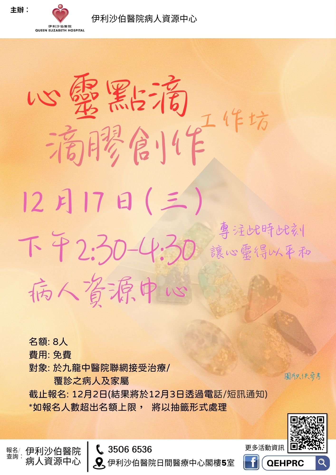 「心靈點滴---滴膠創作」工作坊 | 於九龍中醫院聯網接受治療/ 覆診之病人 或家屬 | 病人或照顧者心靈健康好重要,透過創作獨一無二的滴膠作品,專注此時此刻,讓心靈得以平和。 | 8人 | 現已接受報名 | 2025年12月17日(三) | 下午2:30 - 4:30 | 伊利沙伯醫院病人資源中心 | 免費 | 35066536 |