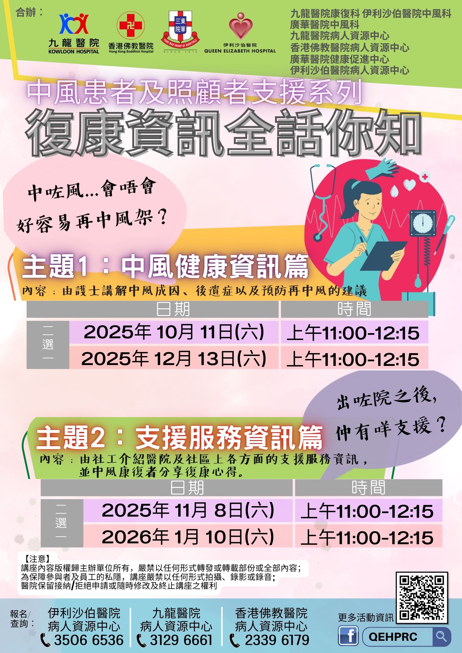 中風患者及照顧者支援系列:中風健康資訊篇 | 於九龍中醫院聯網接受治療/覆診之中風新症病人及家屬優先(最近6個月內有中風病史的為新症病友) | 由專科護士講解中風成因、後遺症以及預防再次中風的建議。 | 10人 | 現已接受報名 | 2025年10月11日(六)、 2025年12月13日(六) | 上午11:00-中午12:15 | 在家中 (透過 Zoom 參與) | 免費 | 35066536 | ||