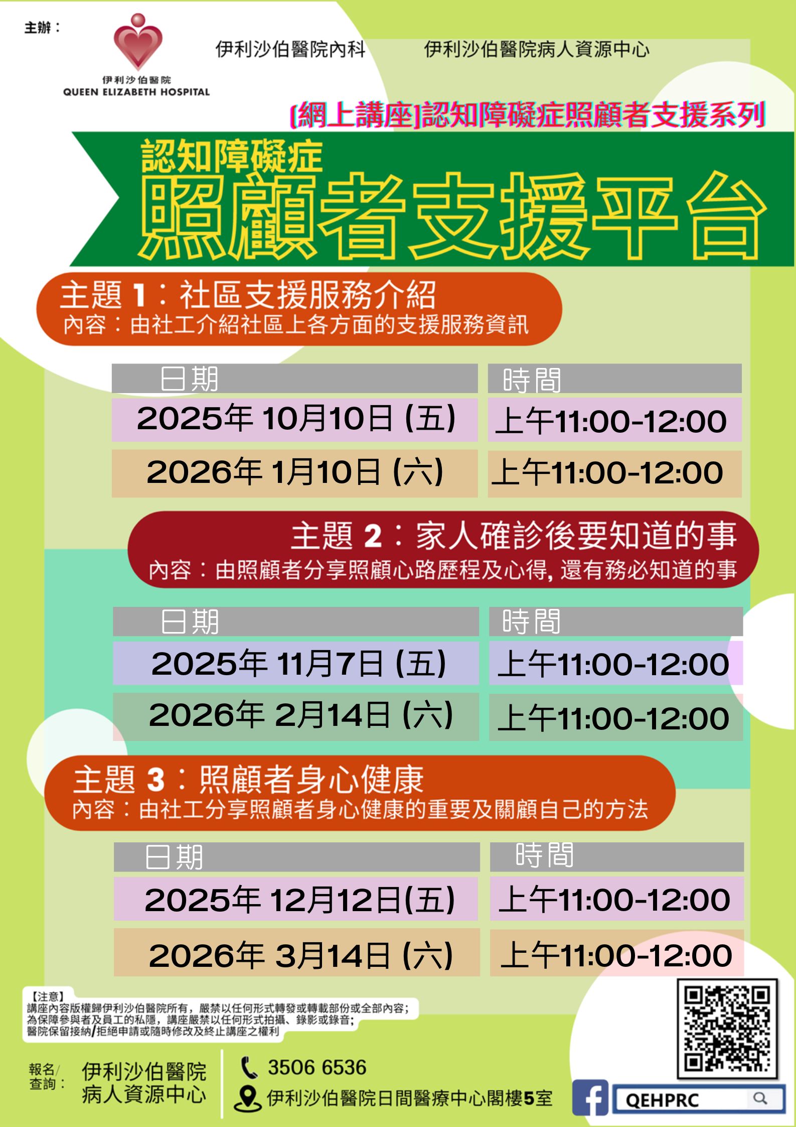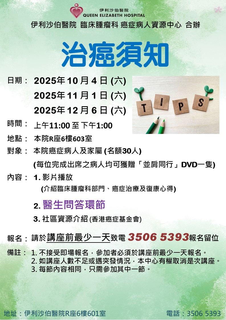 治癌須知 | 本院癌症病人及家屬 | 講座會有醫生問答時間,解答病人的疑問;亦會播放有關伊院臨床腫瘤科部門及癌症治療的短片;以及由地區上的癌症服務機構介紹癌症相關的社區資源服務。 | 每節30名 | 現已接受報名 | 2025年10月4日(六)、11月1日(六)、12月6日(六) | 上午11:00-下午1:00 | 伊利沙伯醫院 癌症病人資源中心 | 免費 | 35065393 |