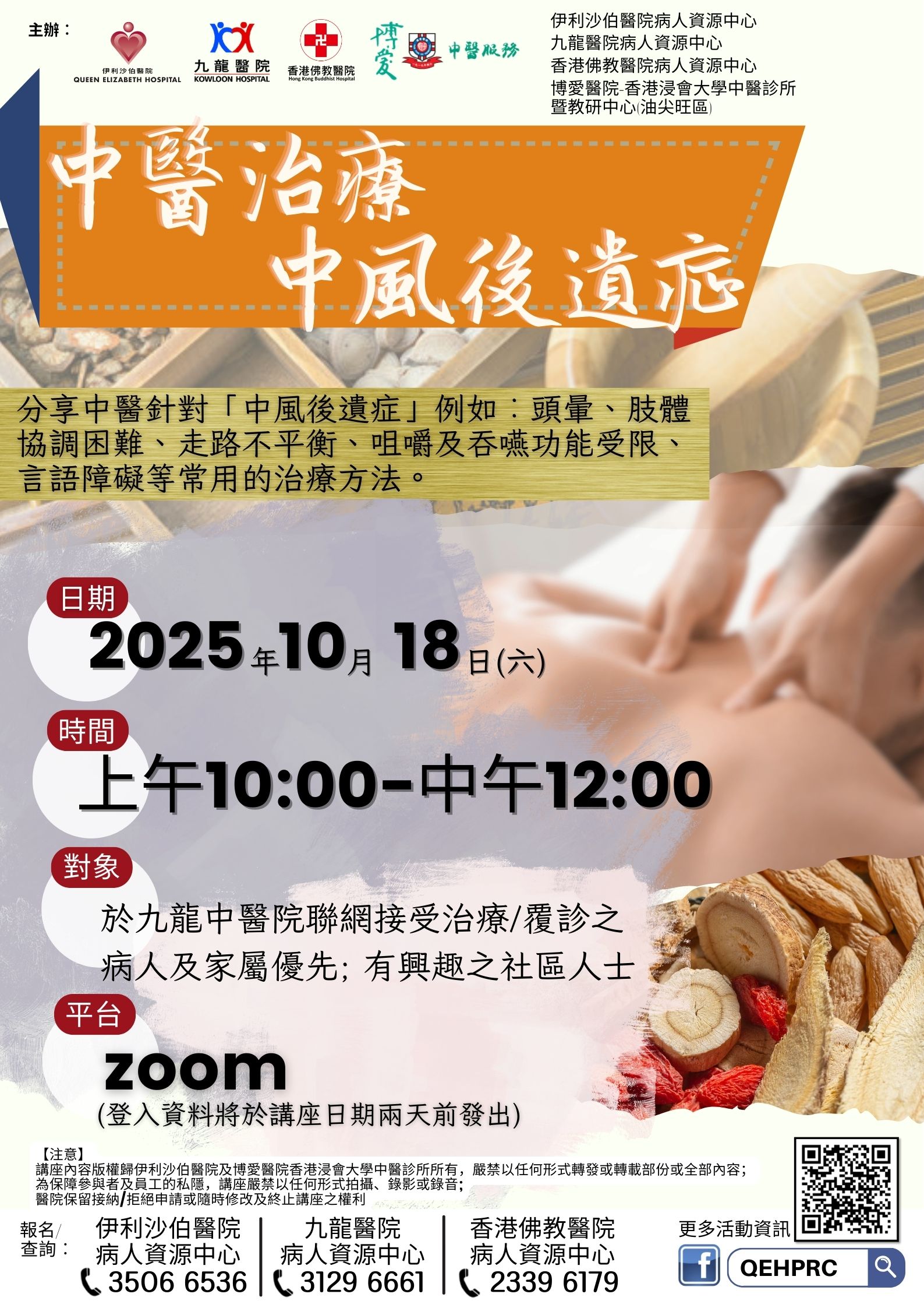中醫治療中風後遺症 | 於九龍中醫院聯網接受治療/ 覆診之病人 或家屬 | 分享中醫針對「中風後遺症」例如︰頭暈、肢體協調困難、走路不平衡、咀嚼及吞嚥功能受限、言語障礙等常用的治療方法。 | 40人 | 現已接受報名 | 2025年10月18日(六) | 上午10:00-中午12:00 | 在家中 (透過 Zoom 參與) | 免費 | 35066536 | ||