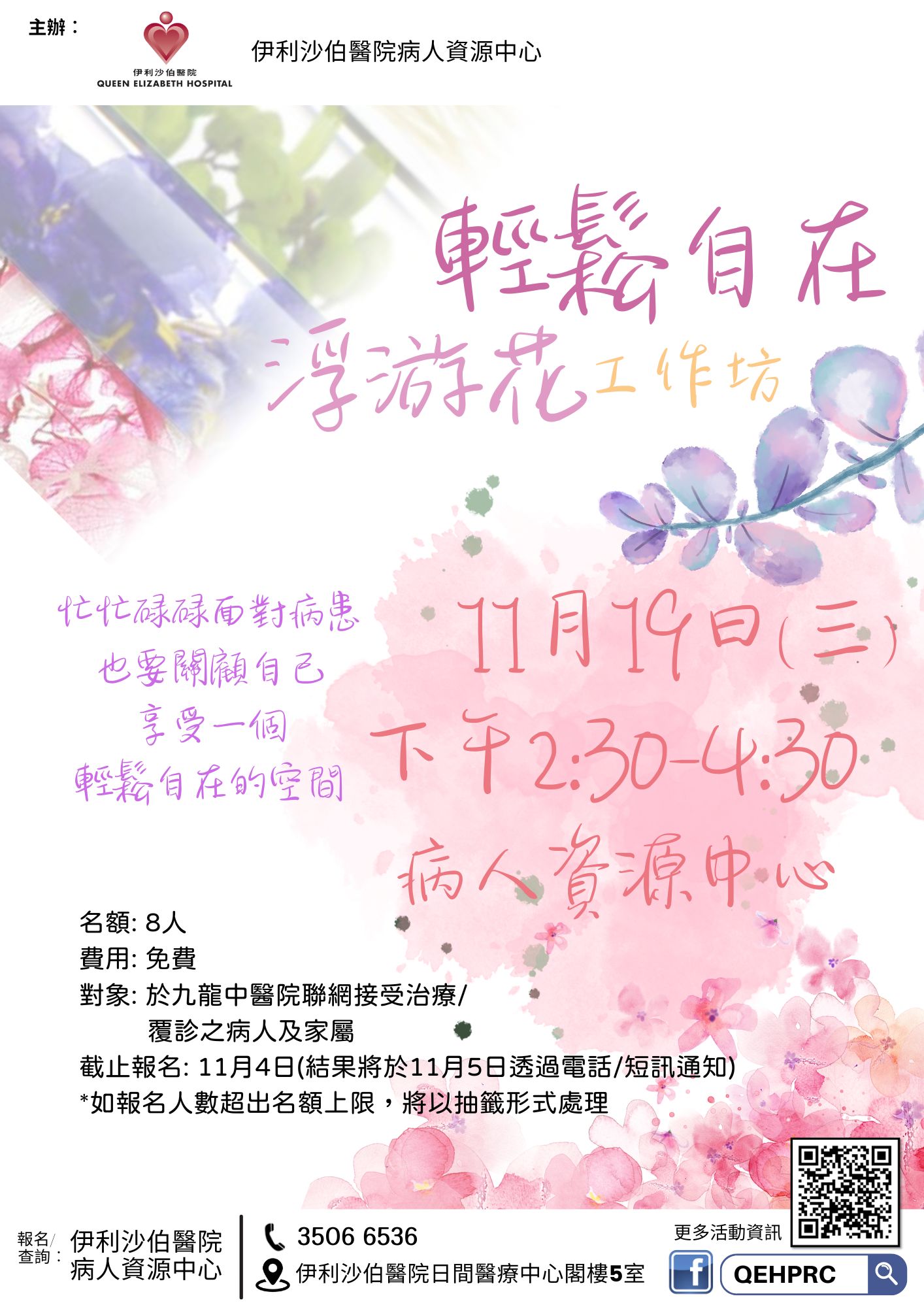 8人 | 現已接受報名 | 2025年11月19日(三) | 下午2:30 - 4:30 | 伊利沙伯醫院病人資源中心 | 免費 | 35066536 | ||