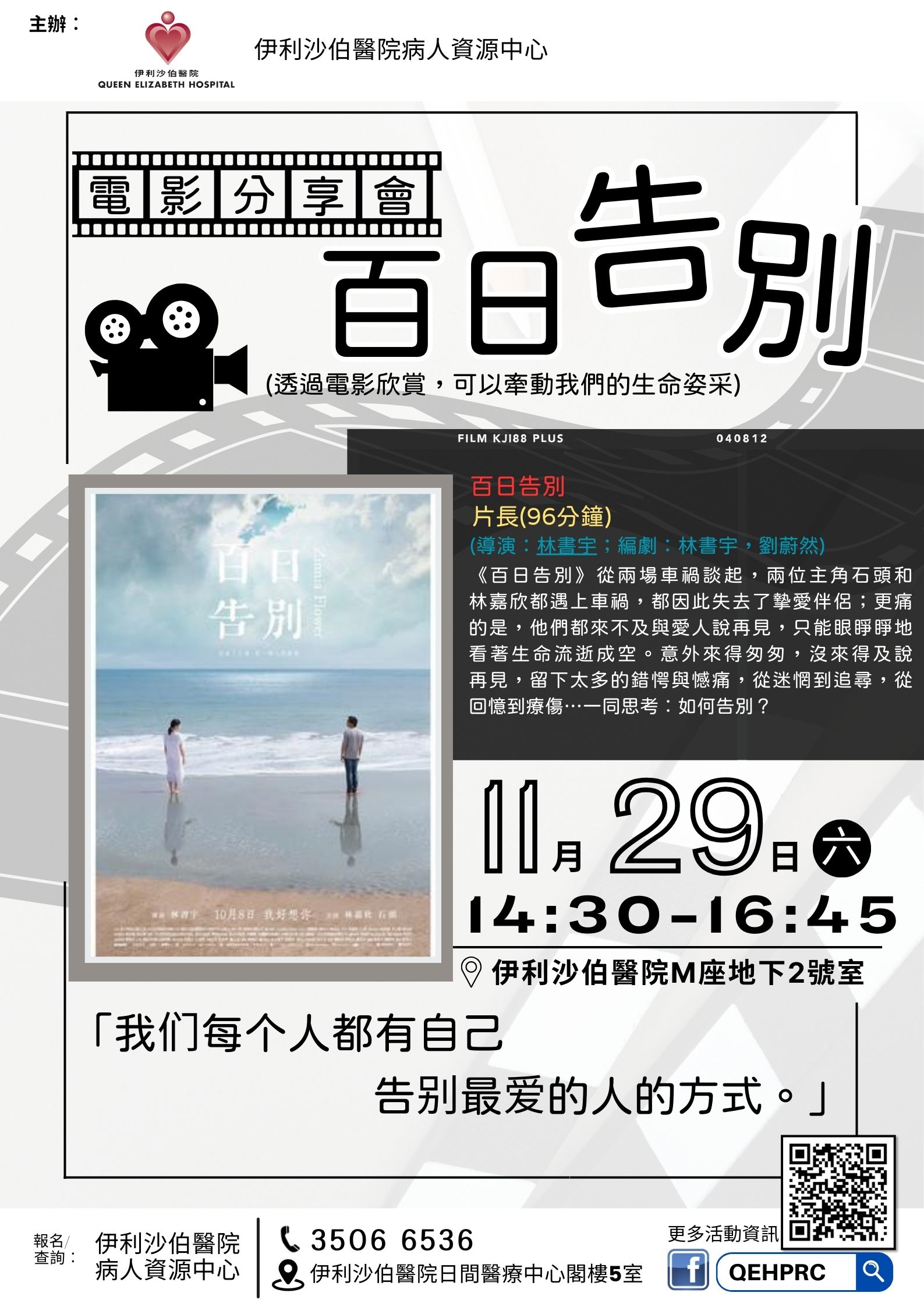 電影欣賞及分享會《百日告別》 | 於九龍中醫院聯網接受治療/ 覆診之病人 或家屬 | 《百日告別》從兩場車禍談起,兩位主角石頭和林嘉欣都遇上車禍,都因此失去了摯愛伴侶;更痛的是,他們都來不及與愛人說再見,只能眼睜睜地看著生命流逝成空。意外來得匆匆,沒來得及說再見,留下太多的錯愕與憾痛,從迷惘到追尋,從回憶到療傷…一同思考︰如何告別? | 40人 | 現已接受報名 | 2025年11月29日(六) | 下午2:30-4:45 | 伊利沙伯醫院M座地下2室 | 免費 | 35066536 | ||