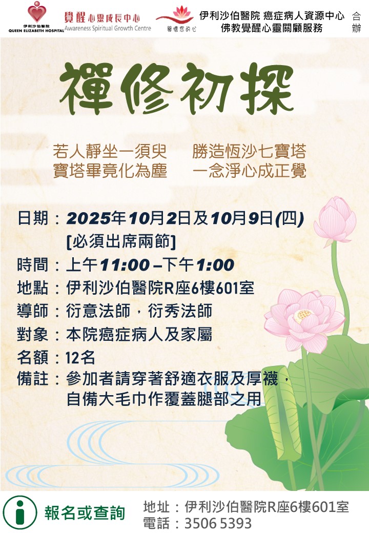禪修初探 | 本院癌症病人及家屬 | 學習禪修靜坐,培養專注及耐性。 (此活動與佛教覺醒心靈關顧服務合辦) | 12名 | 現已接受報名 | 2025年10月2日及10月9日(四) [必須出席兩節] | 上午11:00-下午1:00 | 伊利沙伯醫院 癌症病人資源中心 | 免費 | 35065393 |