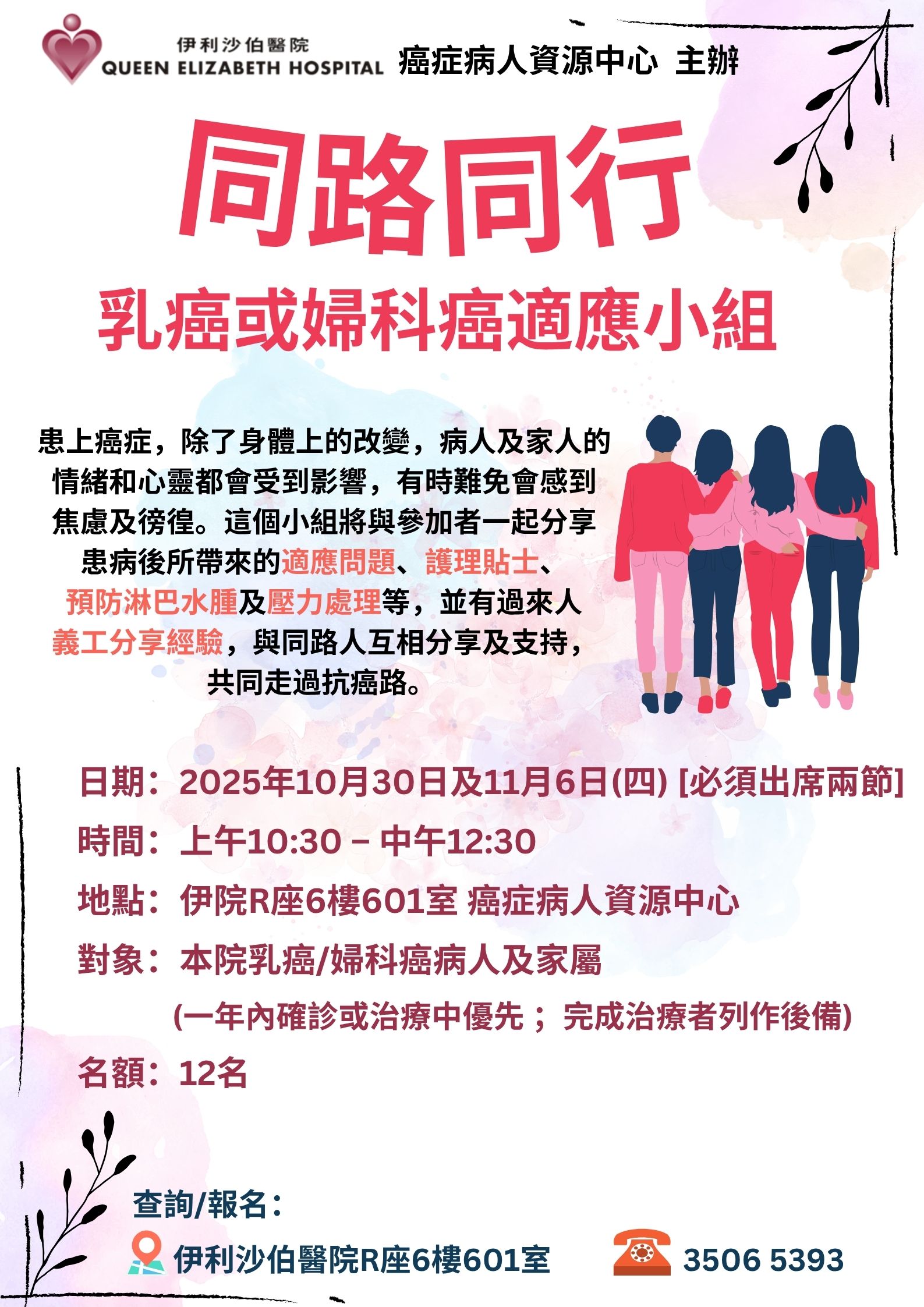 「同路同行」乳癌及婦科癌適應小組 | 本院乳癌/婦科癌病人及家屬 (一年內確診或治療中優先;完成治療者列作後備。) | 與同路人一起分享患病後所帶來的適應問題、治療後護理貼士、預防淋巴水腫及壓力處理等,並有過來人義工分享經驗。 | 12名 | 現已接受報名 | 2025年10月30日及11月6日(四) [必須出席兩節] | 上午10:30-下午12:30 | 伊利沙伯醫院 癌症病人資源中心 | 免費 | 35065393 |