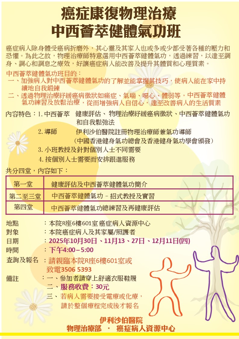 中西薈萃健體氣功班(第六班) | 本院癌症病人及家屬(須完成電療/化療) | 癌症病人除身體受癌病折磨外,其心靈及其家人也或多或少都受著各種的壓力和恐懼。為此之故,物理治療師特意選用中西薈萃健體氣功,透過練習,以達至調身、調心和調息之療效,好讓癌症病人能改善及提升其體質和心理質素。 | 10名 | 現已接受報名 | 2025年10月30日、11月13、27日、12月11日(四) | 下午4:00-5:00 | 伊利沙伯醫院 癌症病人資源中心 | 每位$30 | 35065393 |
