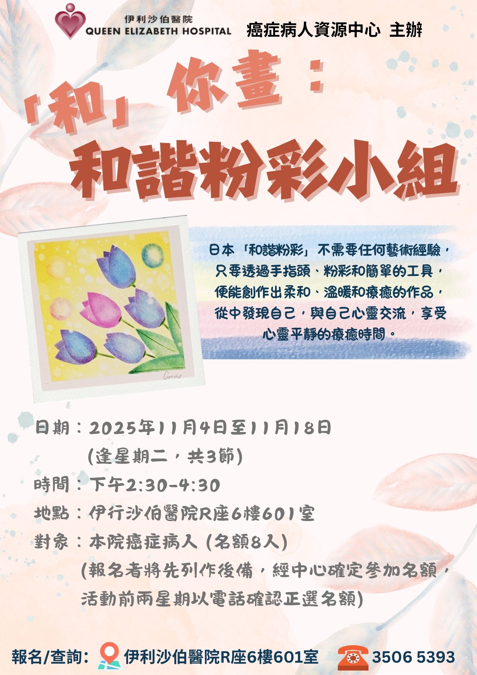 「和」你畫:和諧粉彩小組 | 本院癌症病人(報名者將先列作後備,經中心確定參加名額) | 日本「和諧粉彩」不需要任何藝術經驗,只要透過手指頭、粉彩和簡單的工具,便能創作出柔和、溫暖和療癒的作品,從中發現自己,與自己心靈交流,享受心靈平靜的療癒時間。 | 8名 | 現已接受報名 | 2025年11月4日至11月18日(逢星期二) | 下午2:30-4:30 | 伊利沙伯醫院 癌症病人資源中心 | 免費 | 35065393 |