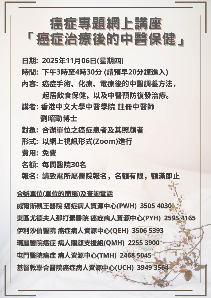 癌症治療後的中醫保健 | 本院癌症病人及家屬 | 癌症手術、化療、電療後的中醫調養方法,起居飲食保健,以及中醫預防復發治療。 | 30名 | 現已接受報名 | 2025年11月6日(四) | 下午3:00-4:30 | 在家中 (透過 Zoom 參與) | 免費 | 35065393 |