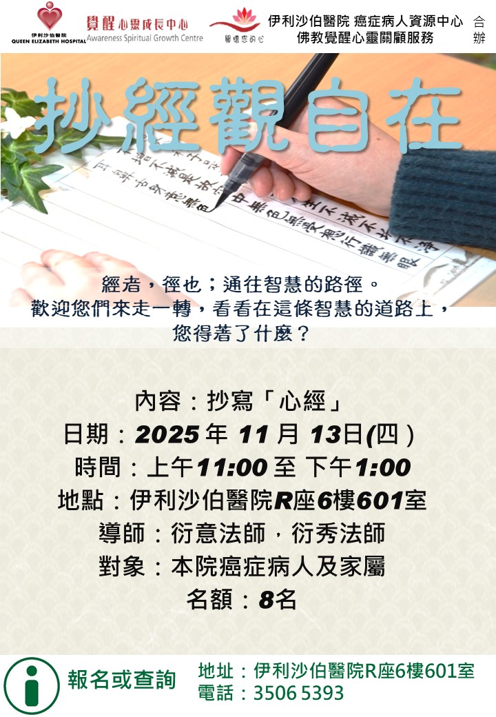 抄經觀自在 | 本院癌症病人及家屬 | 經者,徑也;通往智慧的路徑。歡迎您們來抄寫「心經」,看看在這條智慧的道路上,您得著了什麼? (此活動與佛教覺醒心靈關顧服務合辦) | 8名 | 現已接受報名 | 2025年11月13日(四) | 上午11:00-下午1:00 | 伊利沙伯醫院 癌症病人資源中心 | 免費 | 35065393 |