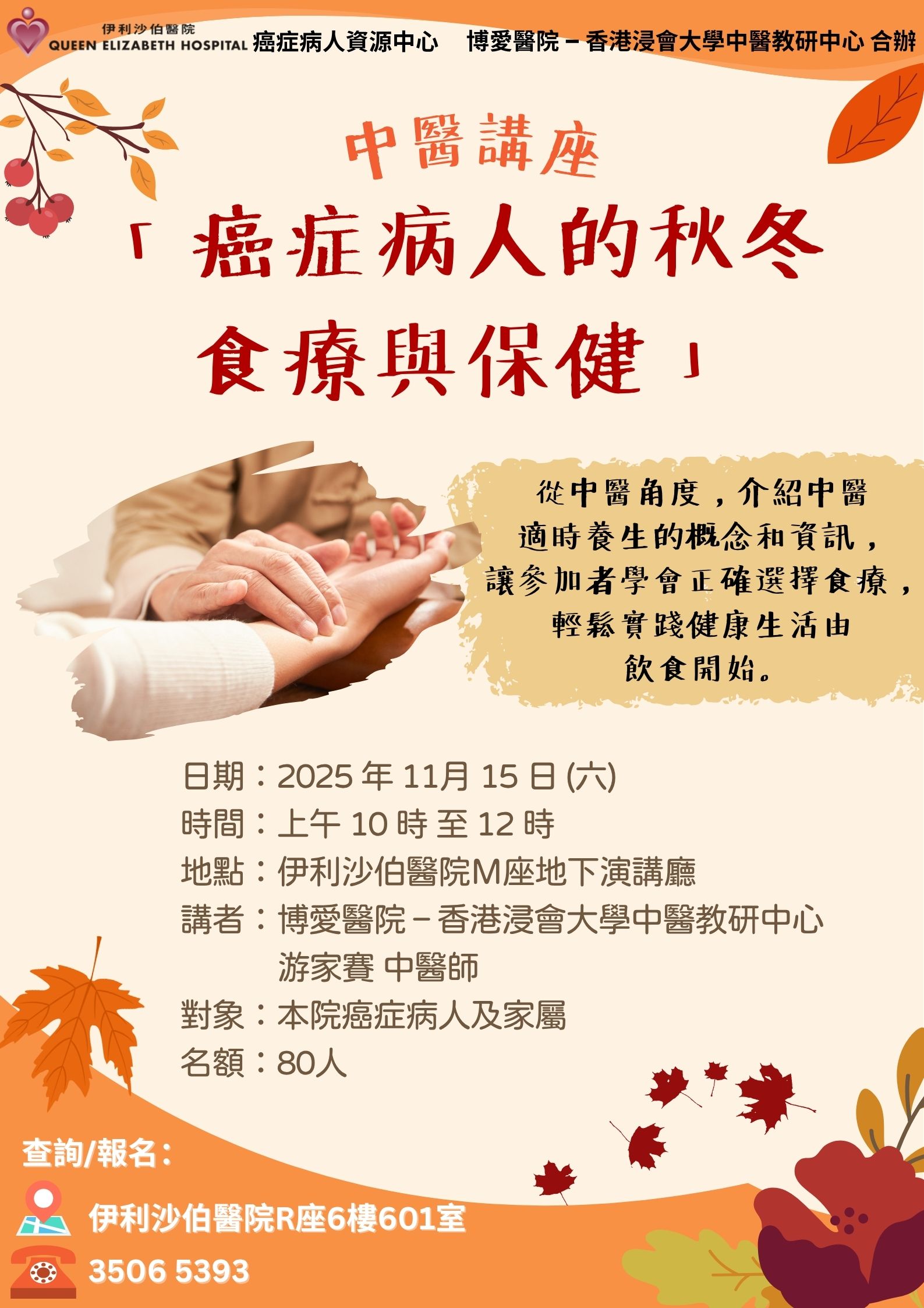 中醫講座:「癌症病人的秋冬食療與保健」 | 本院癌症病人及家屬 | 從中醫角度,介紹中醫適時養生的概念和資訊,讓參加者學會正確選擇食療,輕鬆實踐健康生活由飲食開始。 | 80名 | 現已接受報名 | 2025年11月15日(六) | 上午10:00-中午12:00 | 伊利沙伯醫院 M座地下演講廳 | 免費 | 35065393 |