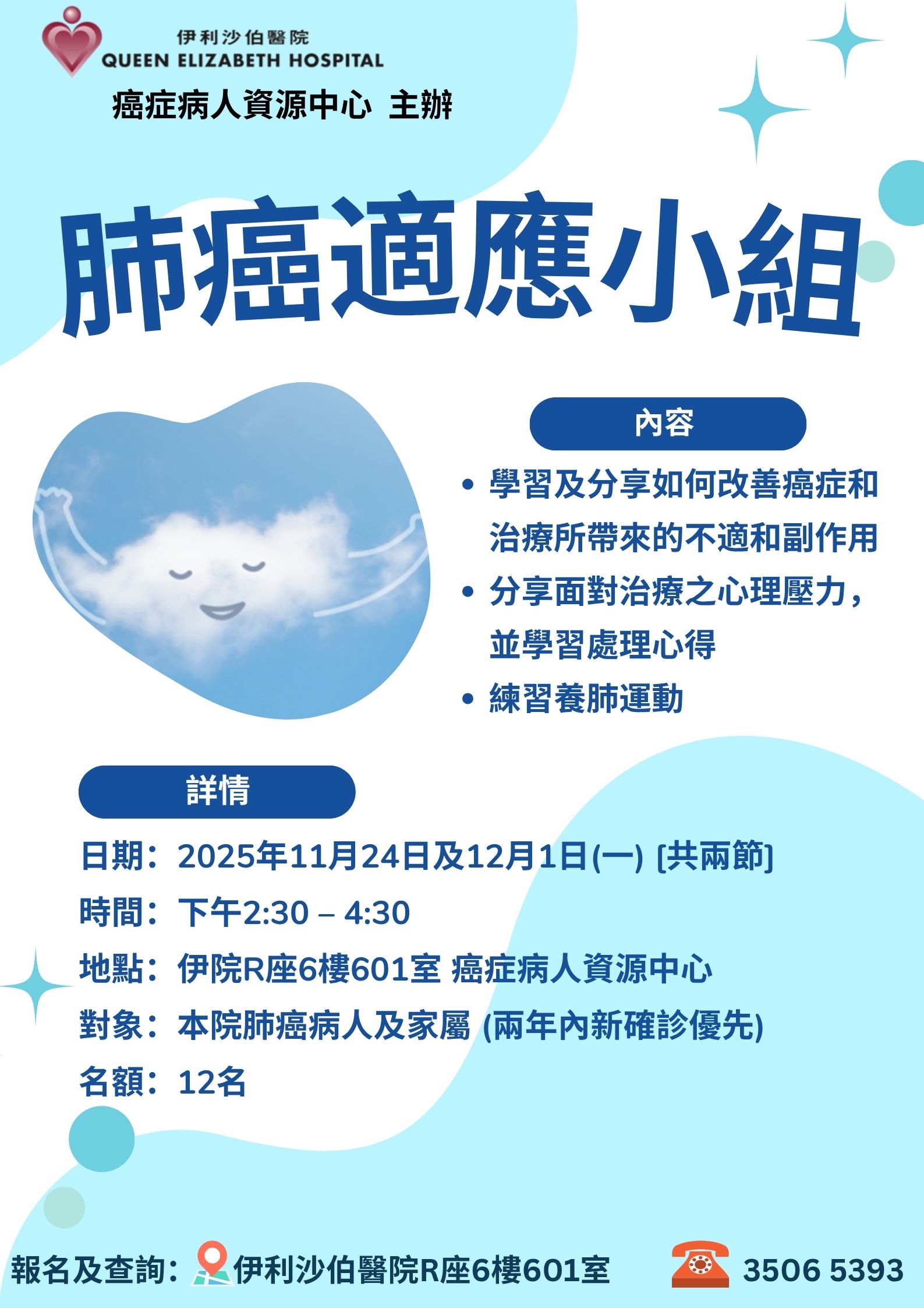 肺癌適應小組 | 本院肺癌病人及家屬 (兩年內新確診優先) | 與同路人一起學習及分享如何改善癌症和治療所帶來的不適和副作⽤;分享面對治療之心理壓力,並學習處理心得;練習養肺運動等。 | 12名 | 現已接受報名 | 2025年11月24日及12月1日(一) [必須出席兩節] | 下午2:30-4:30 | 伊利沙伯醫院 癌症病人資源中心 | 免費 | 35065393 |