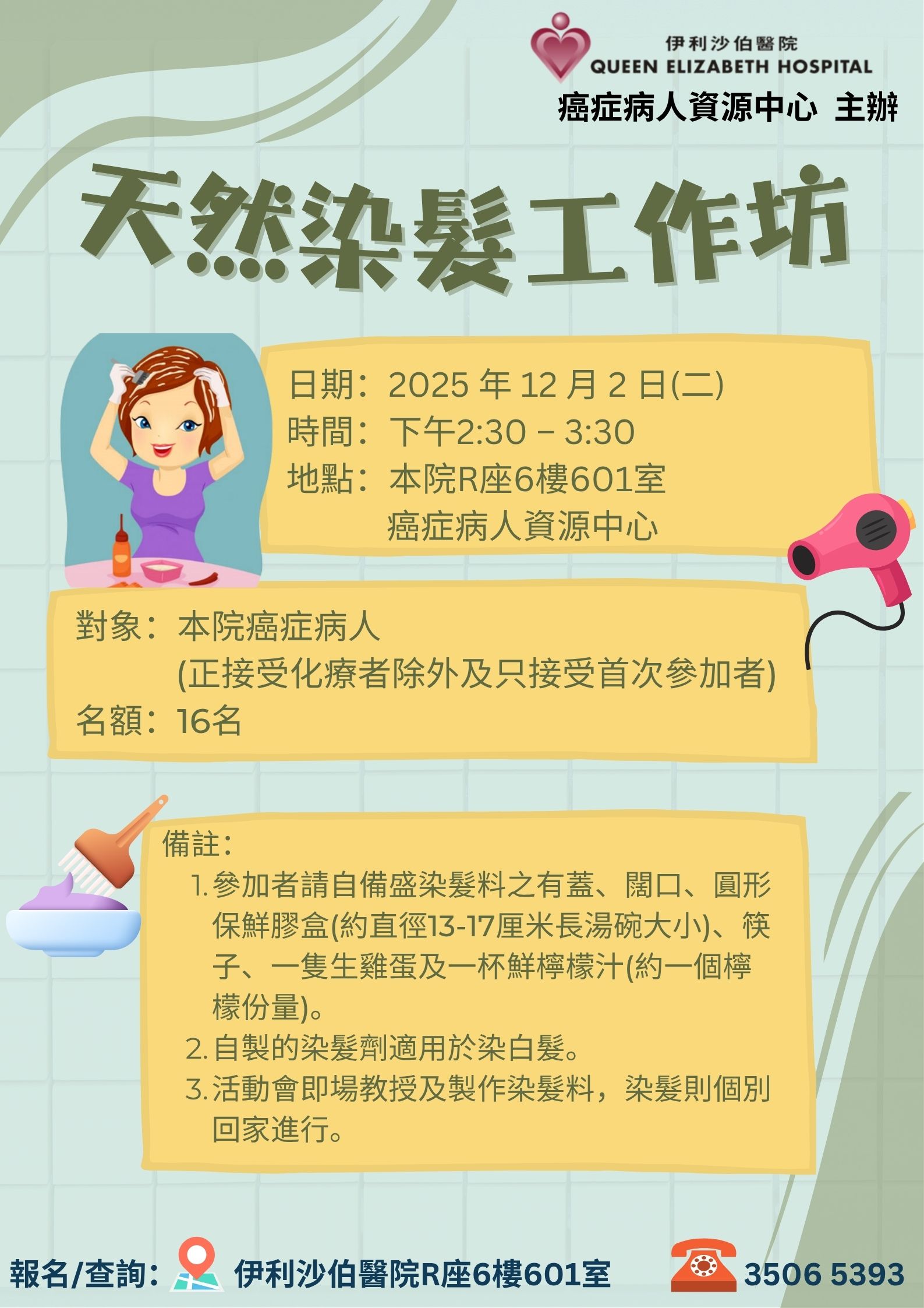 DIY天然染髮工作坊 | 本院癌症病人 (正接受化療者除外及只接受首次參加者) | 教授用天然的方法製作染髮染料。 | 16名 | 現已接受報名 | 2025年12月2日(二) | 下午2:30-3:30 | 伊利沙伯醫院 癌症病人資源中心 | 免費 | 35065393 |