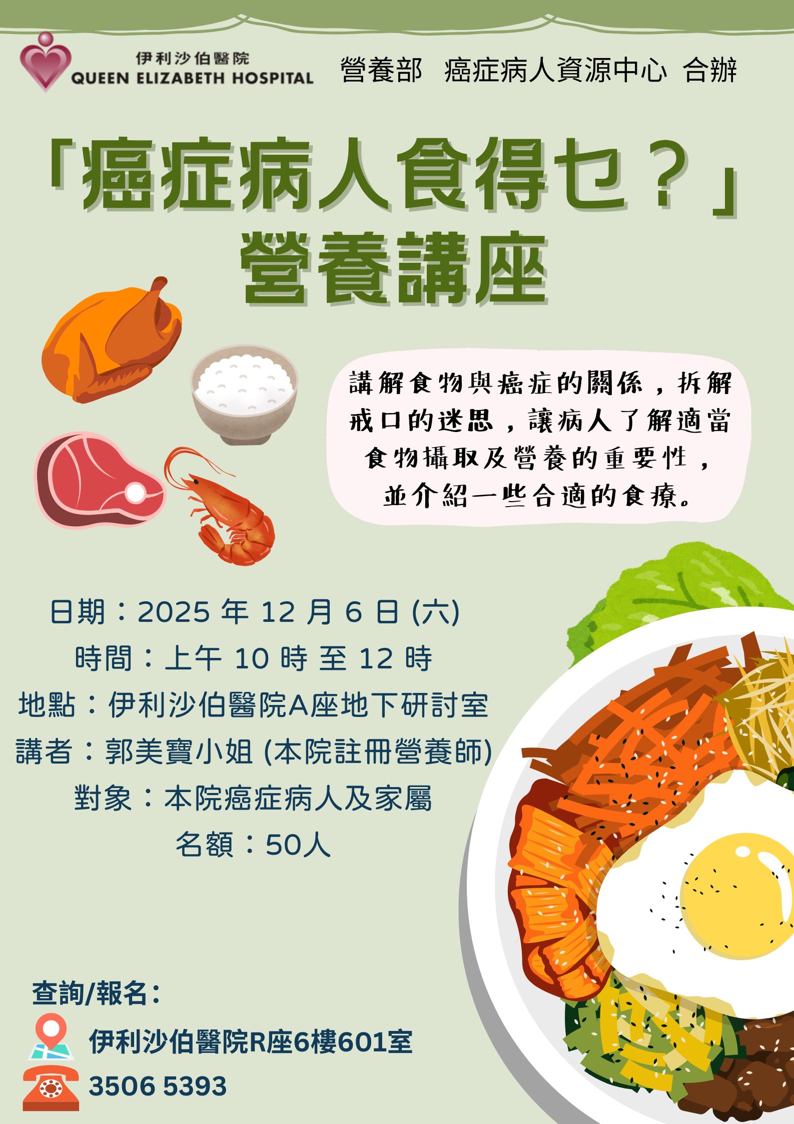「癌症病人食得乜?」營養講座 | 本院癌症病人及家屬 | 營養師會講解食物與癌症的關係,拆解戒口的迷思,讓病人了解適當食物攝取及營養的重要性,並介紹一些合適的食療。 | 50名 | 現已接受報名 | 2025 年 12 月 6 日 (六) | 上午10:00-中午12:00 | 伊利沙伯醫院A座地下研討室 | 免費 | 35065393 |