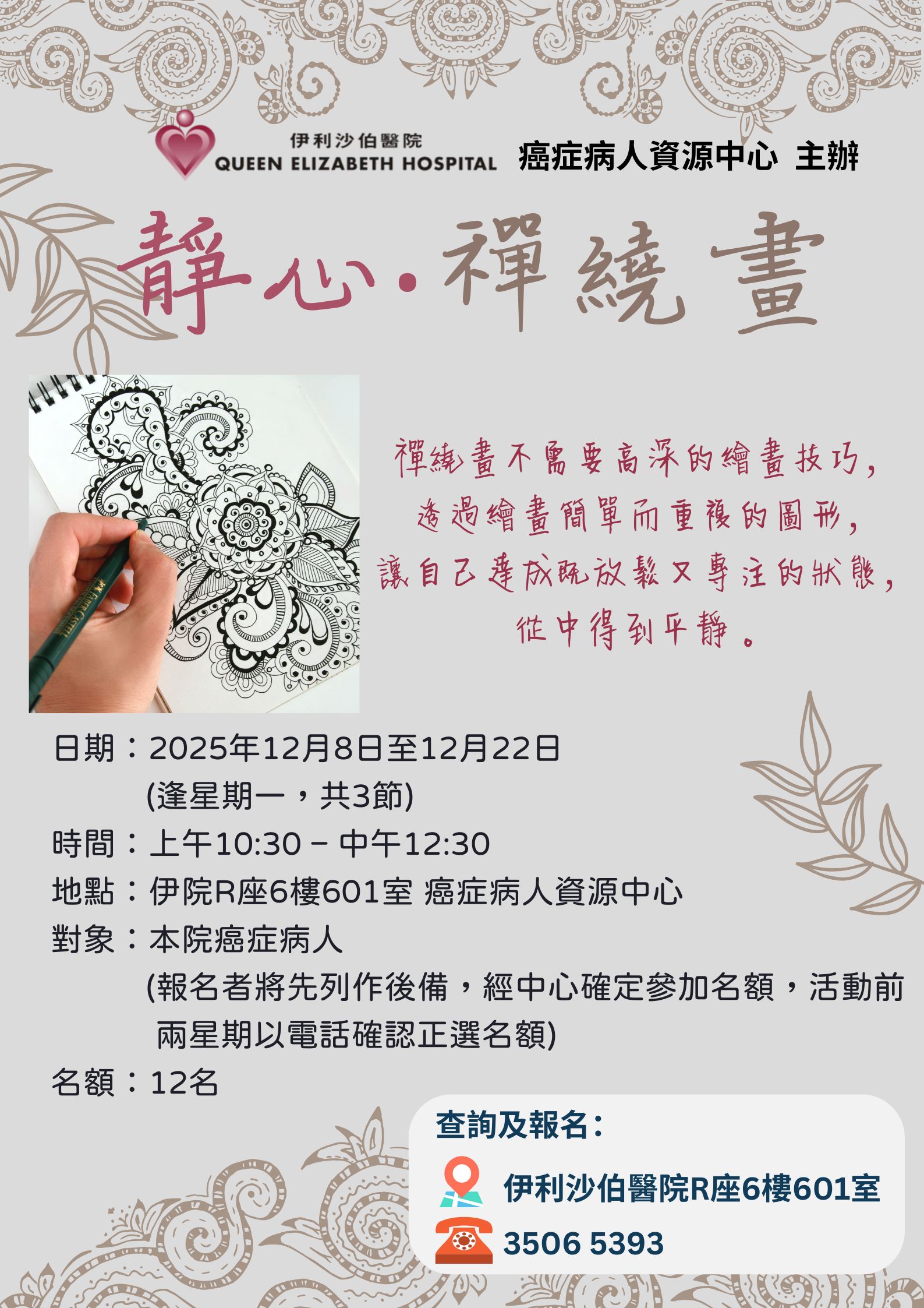 靜心‧禪繞畫 | 本院癌症病人(報名者將先列作後備,經中心確定參加名額) | 禪繞畫不需要高深的繪畫技巧,透過繪畫簡單而重複的圖形,讓自己達成既放鬆又專注的狀態,從中得到平靜。 | 12名 | 現已接受報名 | 2025年12月8日至12月22日(逢星期一,共3節) | 上午10:30-中午12:30 | 伊利沙伯醫院 癌症病人資源中心 | 免費 | 35065393 |