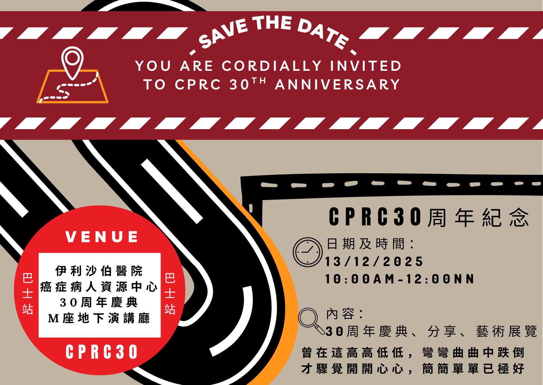 癌症病人資源中心30周年 - 醫家社‧繪出色彩新里程周年慶典 暨 藝術展覽 | 本院癌症病人、康復者、家屬及義工 | 為了慶祝本院癌症病人資源中心成立30周年,將舉辦三十周年誌慶活動,連結眾人一同慶祝,並一起回顧各精彩的經歷、生命及關係。 | 40名 | 現已接受報名 | 2025年12月13日(六) | 上午10:00-12:00 | 伊利沙伯醫院 M座地下演講廳 | 免費 | 35065393 |
