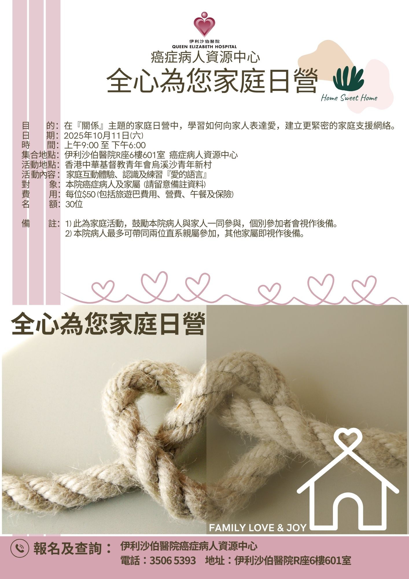 全心為您家庭日營活動 | 本院癌症病人及家屬 (請留意備註資料) | 此家庭日營活動,以『關係』為主題,從而體驗及學習向家人表達愛意,加強家庭間支援網絡。 備註:1) 此為家庭活動,⿎勵本院病人與家⼈一同參與,個別參加者會視作後備。 2) 本院病人最多可帶同兩位直系親屬參加。其他家屬即視作後備。 | 30名 (每位病人可攜同兩位直系親屬參加) | 現已接受報名 | 2025年10月11日(六) | 上午09:00-下午6:00 | 香港中華基督教青年會烏溪沙青年新村 | 每位$50 (包括旅遊巴費用、營費、午餐及保險) | 35065393 |