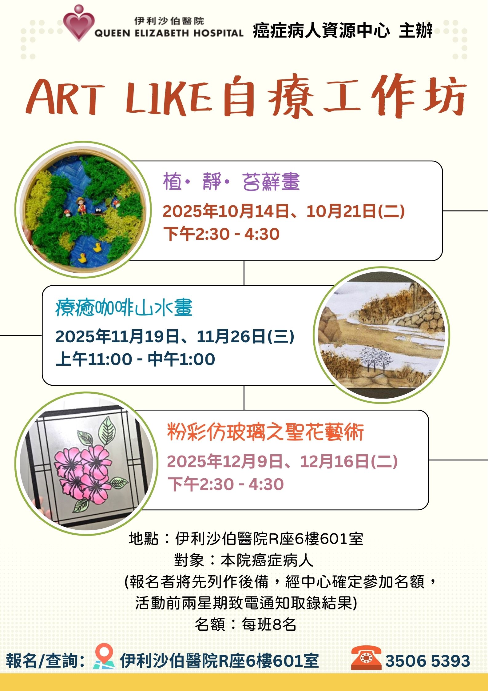"Art Like" 自療工作坊 - 植‧靜‧苔蘚畫 | 本院癌症病人(報名者將先列作後備,經中心確定參加名額) | 苔蘚畫是一種環保且獨特的藝術形式,有著獨特的顏色和質感,不僅具有裝飾價值,還可以達到放鬆和舒緩壓力的效果,有助於營造寧靜和平和的氛圍。 | 8名 | 現已接受報名 | 2025年10月14日及10月21日(二) | 下午2:30-4:30 | 伊利沙伯醫院 癌症病人資源中心 | 免費 | 35065393 |