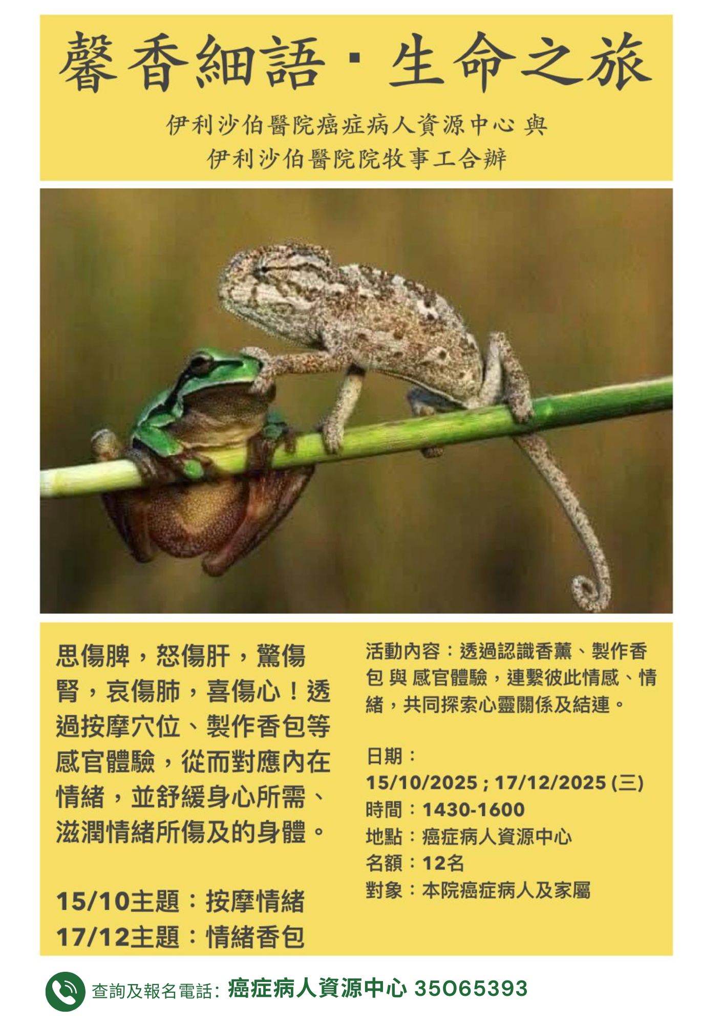 馨香細語‧生命之旅 | 本院癌症病人及家屬 | 思傷脾,怒傷肝,驚傷腎,哀傷肺,喜傷心!透過按摩穴位、製作香包等感官體驗,從而對應內在情緒,並舒緩身心所需、滋潤情緒所傷及的身體。 15/10主題:按摩情緒 17/12主題:情緒香包 (此活動與伊利沙伯醫院院牧事工合辦) | 12名 | 現已接受報名 | 2025年10月15日;2025年12月17日(三) | 下午2:30-4:00 | 伊利沙伯醫院 癌症病人資源中心 | 免費 | 35065393 |