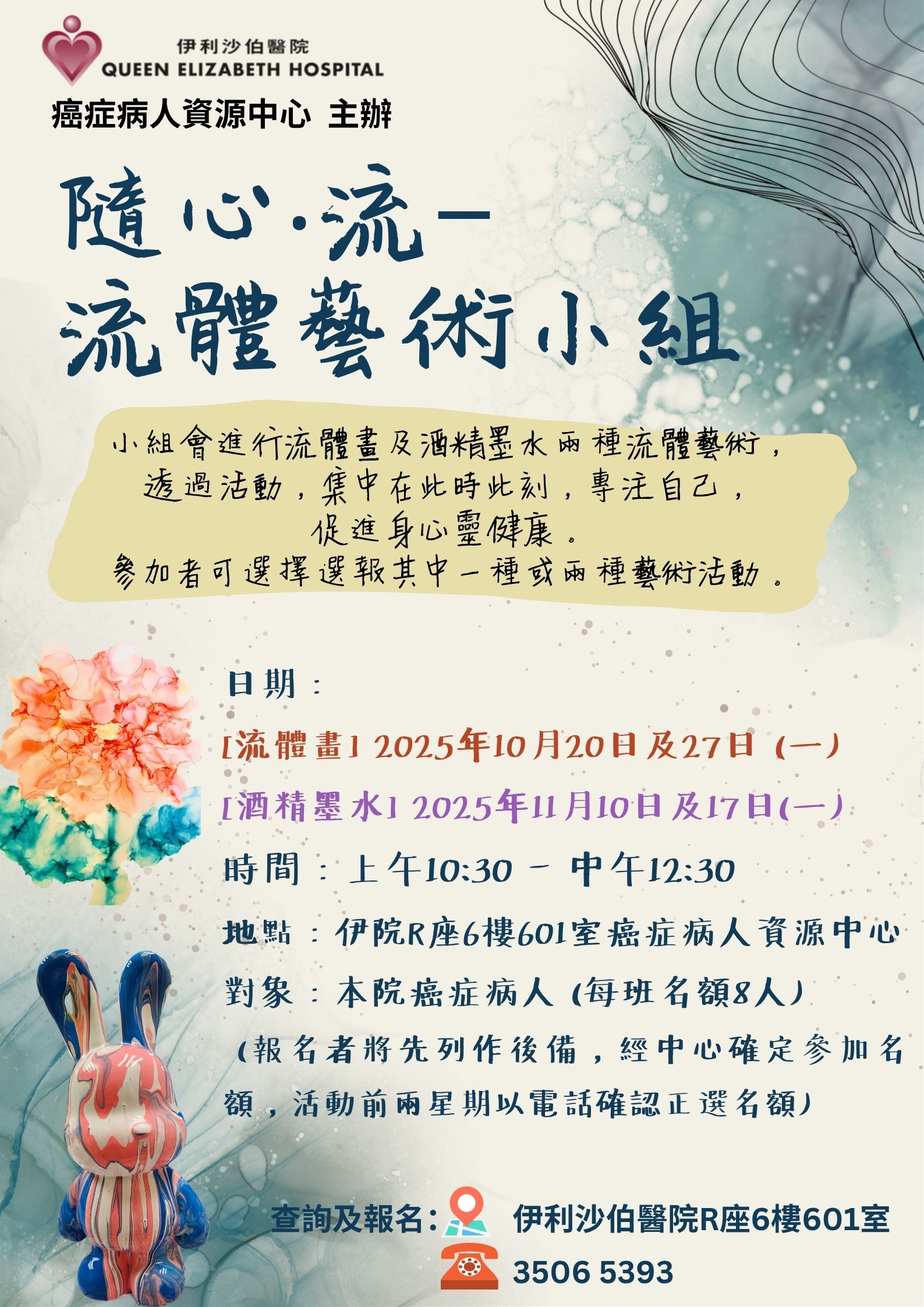 隨心‧流 - 流體藝術小組 | 本院癌症病人(報名者將先列作後備,經中心確定參加名額) | 跟隨酒精墨水及流體顏料的流動,創造夢幻而抽象的美麗畫作,感受當下的輕鬆自在。參加者可選擇選報其中一種或兩種藝術活動。 | 每班8名 | 現已接受報名 | [流體畫] 2025年10月20日及27日 (一) [酒精墨水] 2025年11月10日及17日(一) | 上午10:30-下午12:30 | 伊利沙伯醫院 癌症病人資源中心 | 免費 | 35065393 |