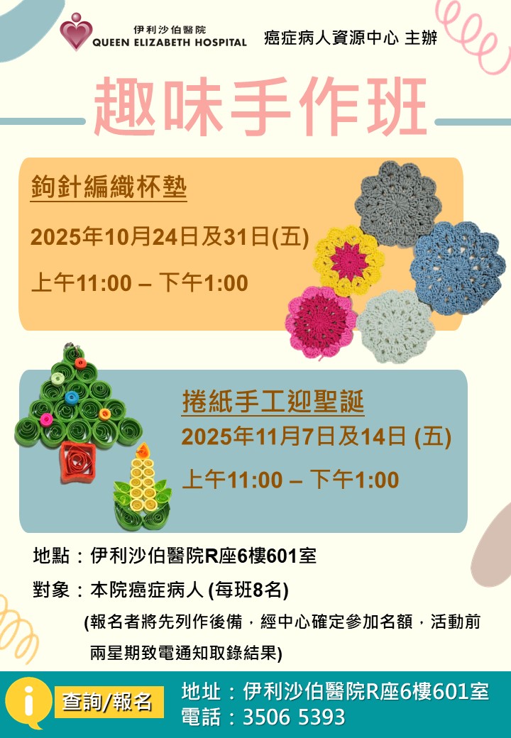 趣味手作班 - 鉤針編織杯墊 | 本院癌症病人 | 用鉤針編織最基本的針法開始編織杯墊,令初學者們更能輕易掌握。 | 8名 | 現已接受報名 | 2025年10月24日及10月31日(五) | 上午11:00-下午1:00 | 伊利沙伯醫院 癌症病人資源中心 | 免費 | 35065393 |