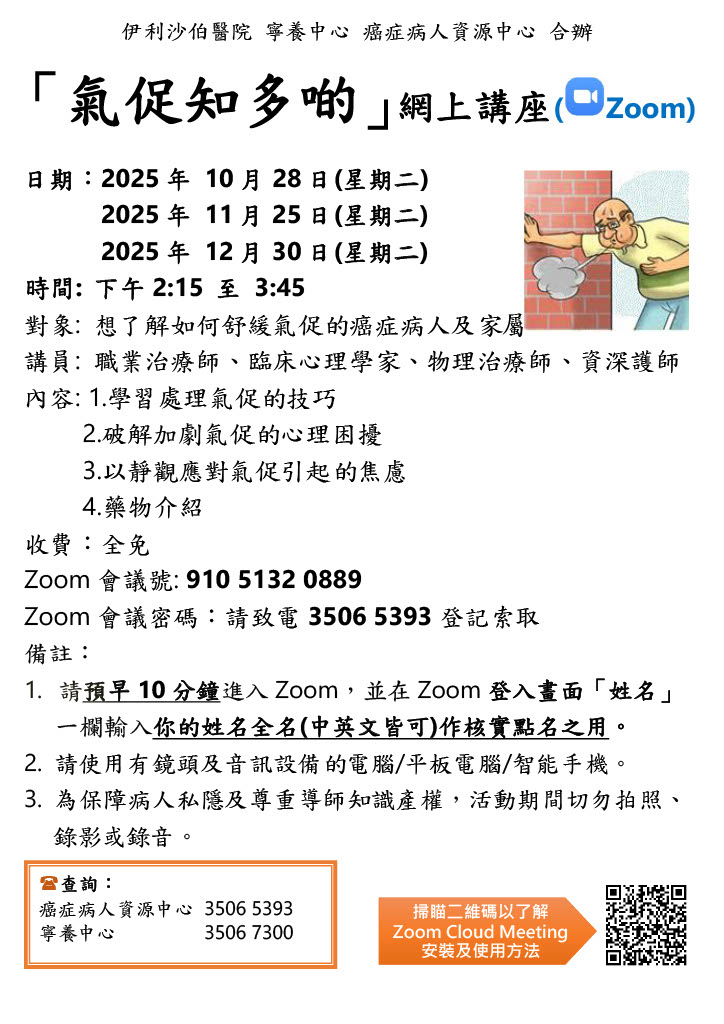 「氣促知多啲」網上講座 | 本院癌症病人及家屬 | 由職業治療師、臨床心理學家、物理治療師及資深護師協助肺癌病人學習處理氣促的技巧、破解加劇氣促的心理困擾、以靜觀應對氣促引起的焦慮及藥物介紹。 | 每節30名 | 現已接受報名 | 2025年10月28日(二)、11月25日(二)、12月30日(二) | 下午2:15-3:45 | 在家中 (透過 Zoom 參與) | 免費 | 35065393 |
