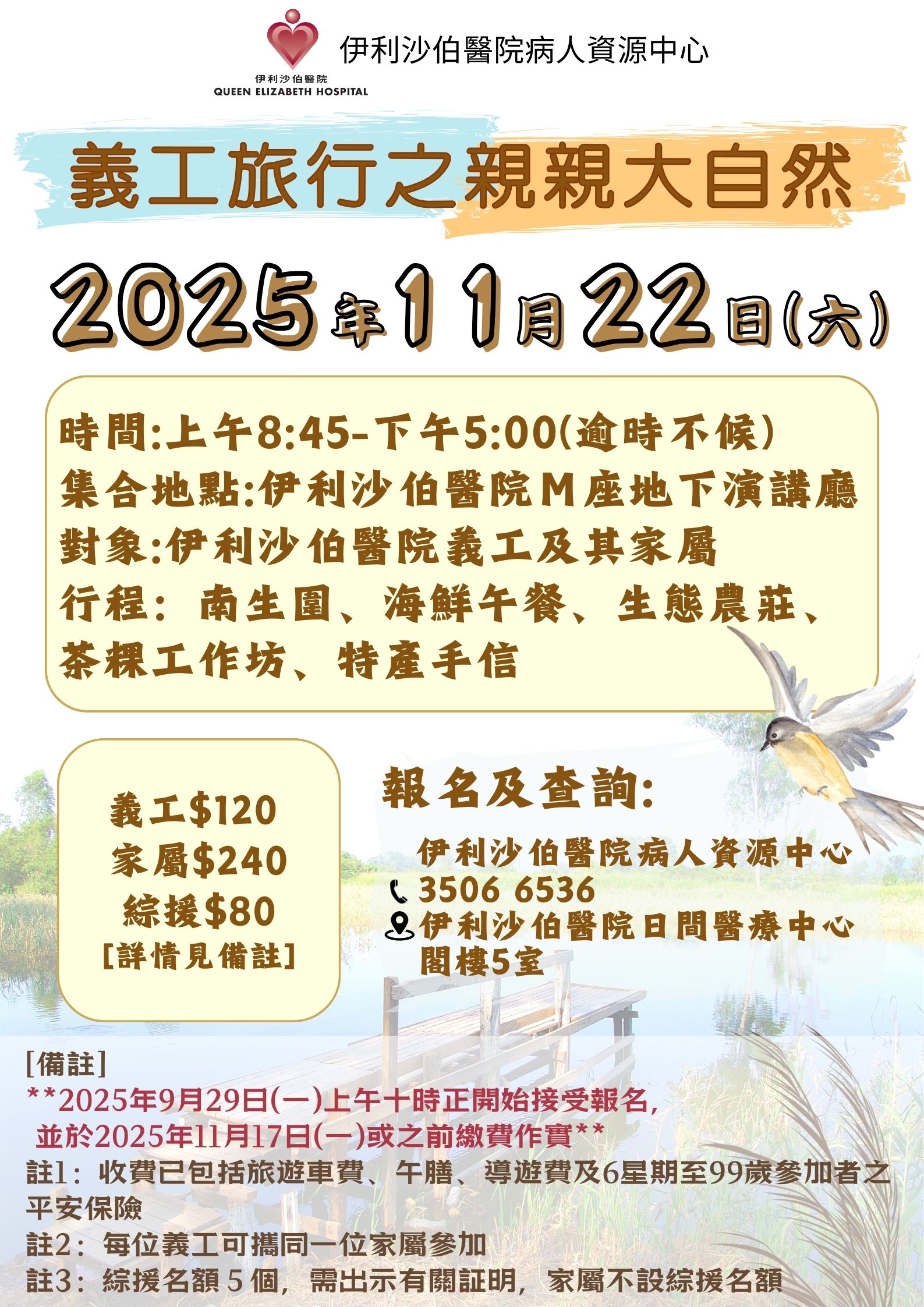 名額有限,先到先得 | 報名及查詢: 35066536 **開始報名日期: 2025年9月29日(一)上午十時正 | 2025年11月22日(六) | 上午8:45- 下午5:00 | 伊利沙伯醫院 M座地下演講廳集合 | 義工$120 家屬$240 綜援$80 [詳情見備註] | 3506 6536 | |||||