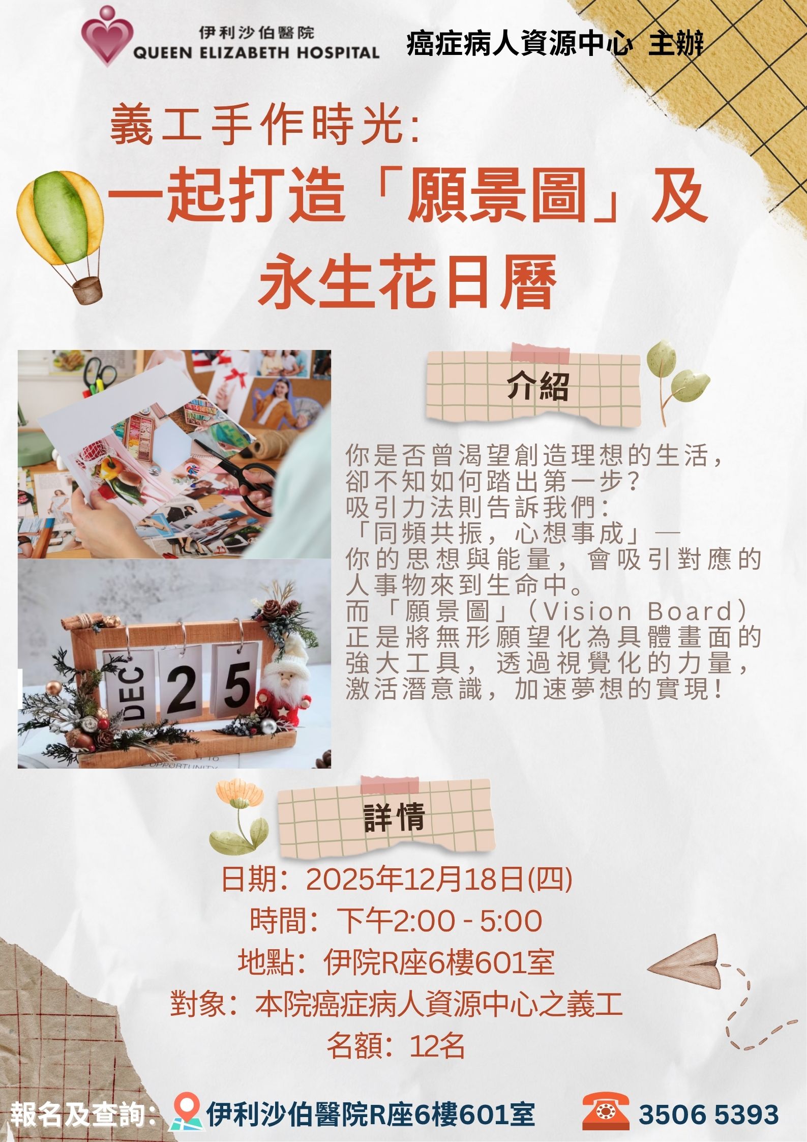 義工手作時光:一起打造「願景圖」及永生花日曆 | 本院癌症病人資源中心之義工 | 你是否曾渴望創造理想的生活,卻不知如何踏出第一步?吸引力法則告訴我們:「同頻共振,心想事成」─你的思想與能量,會吸引對應的人事物來到生命中。而「願景圖」(V i s i o n B o a r d)正是將無形願望化為具體畫面的強大工具,透過視覺化的力量,激活潛意識,加速夢想的實現! | 12名 | 現已接受報名 報名及查詢: 3506 5393 | 2025年12月18日(四) | 下午2:00- 5:00 | 伊利沙伯醫院 癌症病人資源中心 | 免費 | 35065393 |